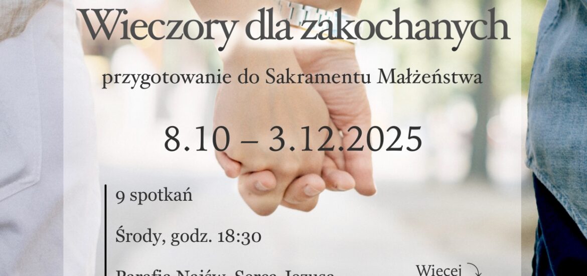Serdecznie zapraszamy do zapisywania się na najbliższe Wieczory dla Zakochanych, które odbędą się od 8 października do 3 grudnia 2025 r. Wszystkie szczegóły znajdują się na podstronie: https://spotkania-poznan.pl/dla-zakochanych/