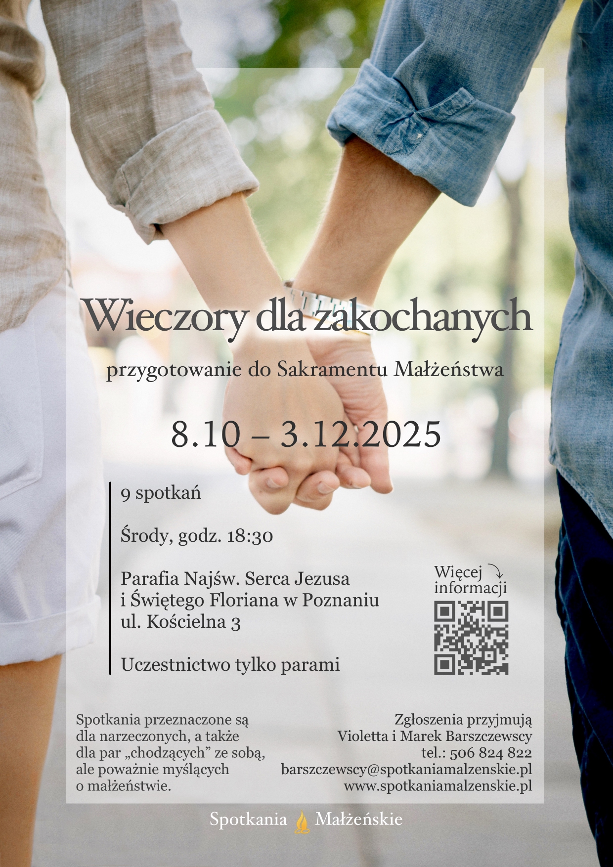 Najbliższe Wieczory dla Zakochanych odbędą się od 8 października do 3 grudnia 2025 r. w parafii Najświętszego Serca Jezusa i św. Floriana przy ul. Kościelnej 3 w Poznaniu.